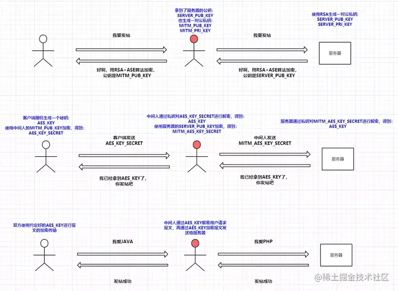 所谓道高一尺魔高一丈,中间人为了对应这种加密方法又想出了一个新的破解方案,既然拿不到AES_KEY,那我就把自己模拟成一个客户端和服务器端的结合体,在用户->中间人的过程中中间人模拟服务器的行为,这样可以拿到用户请求的明文,在中间人->服务器的过程中中间人模拟客户端行为,这样可以拿到服务器响应的明文,以此来进行中间人攻击: