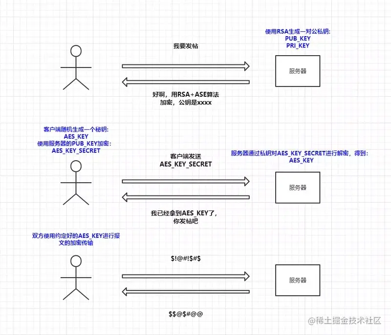 那么对于这种情况,我们肯定就会考虑能不能将秘钥进行加密不让中间人看到呢?答案是有的,采用非对称加密,我们可以通过 RSA 算法来实现。这个步骤实际操作也是比较简单的,