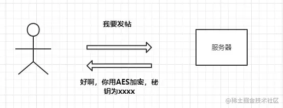 这个时候可能就有人想到了,既然内容是明文那我使用对称加密的方式将报文加密这样中间人不就看不到明文了吗,于是如下改造: