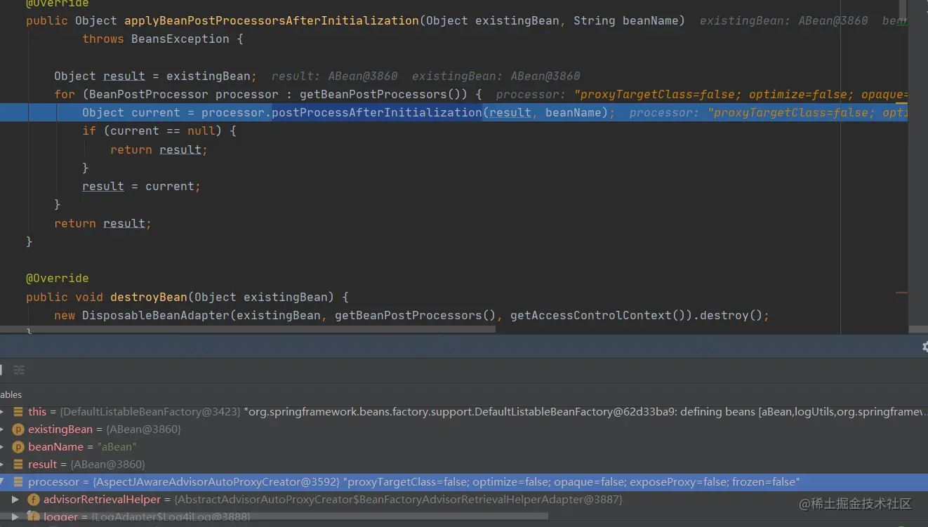 1.Spring对象的创建流程在Spring学习笔记中已经有详细的描述,我们直接进入AbstractAutowireCapableBeanFactory#doCreateBean中initializeBean方法。Spring会在applyBeanPostProcessorsAfterInitialization()方法中完成对对象的代理。可以看到此时bean对象还未被代理增强。