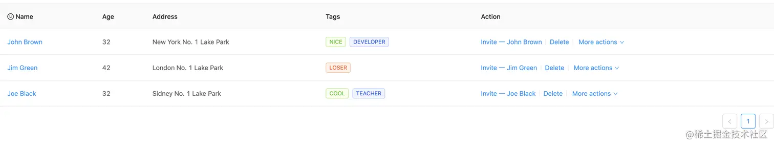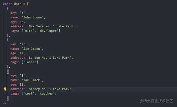 假设现在我们要开发一个表格功能,我这里使用的ui组件是ant-design-vue,从官网copy一个简单的demo下来