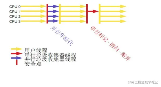 **并行收集:**并行收集使用多线程处理垃圾回收工作,因而速度快,效率高。而且理论上CPU数目越多,越能体现出并行收集器的优势。