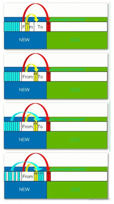一般情况下,当新对象生成,并且在Eden申请空间失败时,就会触发Scavenge GC,对Eden区域进行GC,清除非存活对象,并且把尚且存活的对象移动到Survivor区。然后整理Survivor的两个区。这种方式的GC是对年轻代的Eden区进行,不会影响到年老代。因为大部分对象都是从Eden区开始的,同时Eden区不会分配的很大,所以Eden区的GC会频繁进行。因而,一般在这里需要使用速度快、效率高的算法,使Eden去能尽快空闲出来。