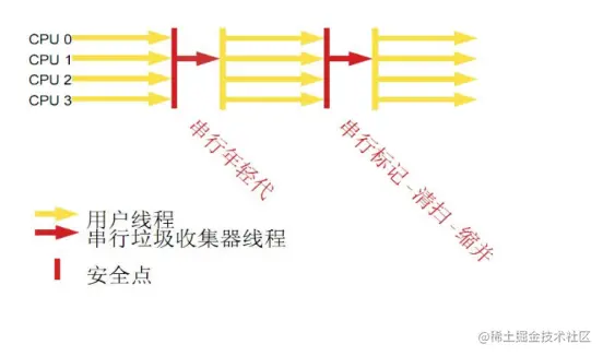 **串行收集:**串行收集使用单线程处理所有垃圾回收工作,因为无需多线程交互,实现容易,而且效率比较高。但是,其局限性也比较明显,即无法使用多处理器的优势,所以此收集适合单处理器机器。当然,此收集器也可以用在小数据量(100M左右)情况下的多处理器机器上。