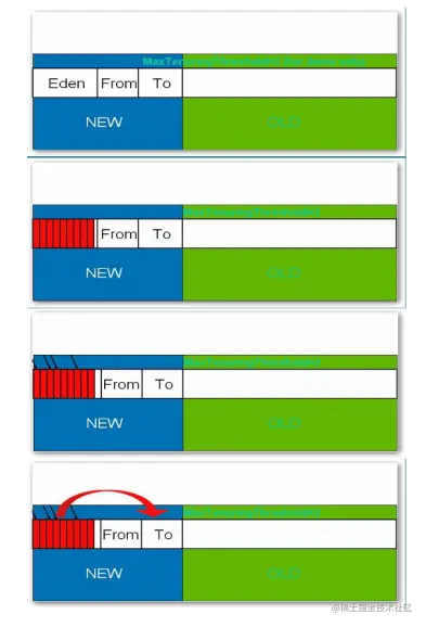年轻代分三个区。一个Eden区,两个Survivor区(一般而言)。大部分对象在Eden区中生成。当Eden区满时,还存活的对象将被复制到Survivor区(两个中的一个),当这个Survivor区满时,此区的存活对象将被复制到另外一个Survivor区,当这个Survivor去也满了的时候,从第一个Survivor区复制过来的并且此时还存活的对象,将被复制“年老区(Tenured)”。需要注意,Survivor的两个区是对称的,没先后关系,所以同一个区中可能同时存在从Eden复制过来 对象,和从前一个Survivor复制过来的对象,而复制到年老区的只有从第一个Survivor去过来的对象。而且,Survivor区总有一个是空的。同时,根据程序需要,Survivor区是可以配置为多个的(多于两个),这样可以增加对象在年轻代中的存在时间,减少被放到年老代的可能。