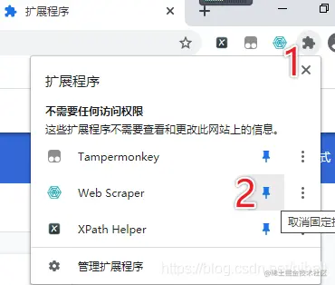 不写代码可以写爬虫程序吗?老师说可以,无编码学爬虫之一。 安装完毕,将插件展示到浏览器扩展位置。按照以下两个步骤操作即可,最终在浏览器出现一个蜘蛛网图标表示成功。