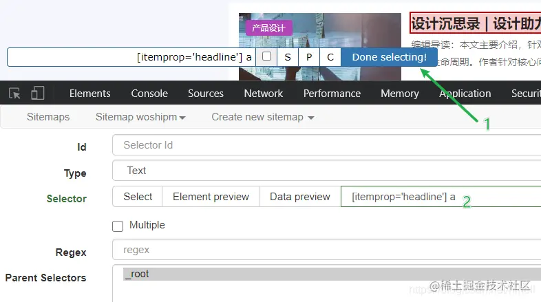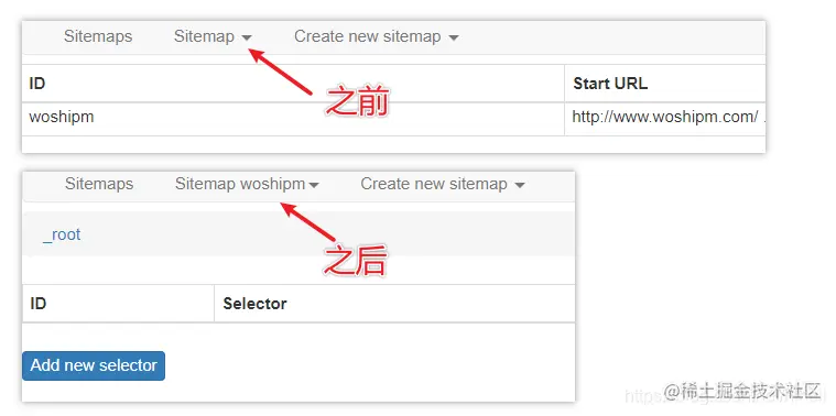 sitemap name : woshipm start url : www.woshipm.com/ 创建完毕之后默认进入如下界面,注意两个位置,第一个红色框选区域,_root 表示根节点,记住是名词就行了,表示你刚才设置页面的网页结构。下面的按钮是一个选择器,稍后讲解。