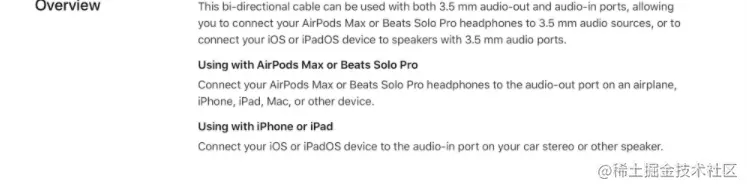 苹果建议将其用于将 AIrPods Max 和 Beats Solo Pro 耳机连接到 3.5 毫米音频源,这将使个人音频配件可以与不提供无线连接的硬件一起使用。例如飞机上,配合这根线加转接有,AIrPods Max可与飞机座椅上的耳机插孔一起使用。