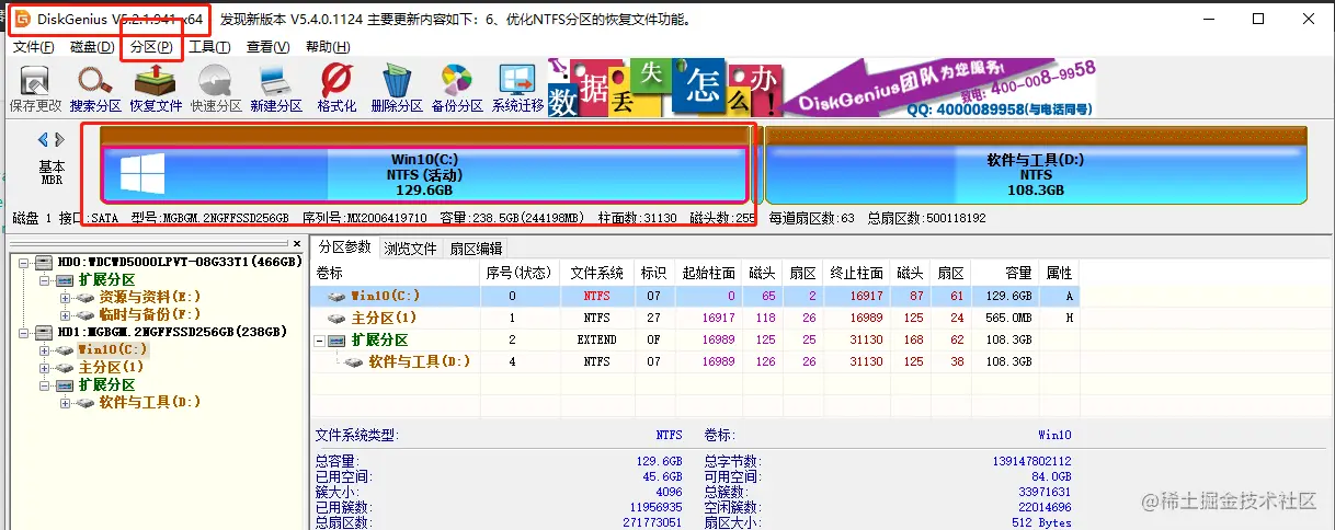 先下载该软件,打开后,选择自己向扩容的磁盘,第三步是选择左上角的【分区(P)】