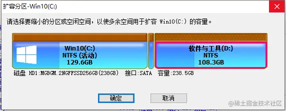 选择D盘,即我们需要将D盘的一些空间扩容到C盘上。 点击确定。