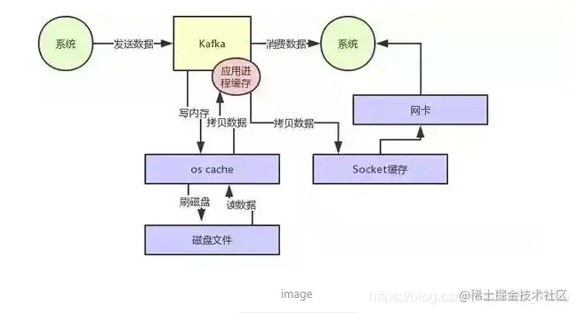 接着从操作系统的 OS Cache 里拷贝数据到应用程序进程的缓存里,再从应用程序进程的缓存里拷贝数据到操作系统层面的 Socket 缓存里。