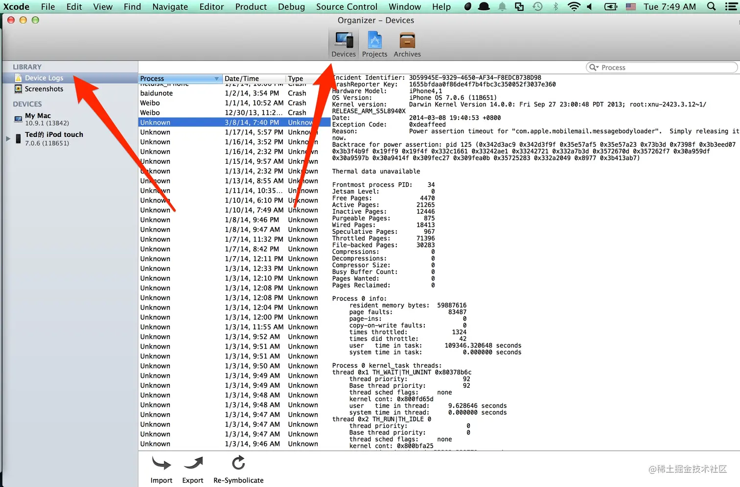 然后把.crash文件拖到Device Logs或者选择下面的import导入.crash文件。