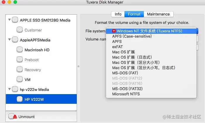 将磁盘与我们的苹果电脑连接,便能够快速读写NTFS文件系统。如果需要实现格式化操作,则点击“File system(文件系统)”下拉框进行选择,输入卷名称,如下图所示。