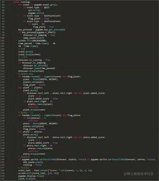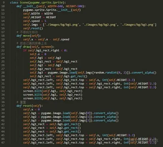 主循环主要包括四个功能,一是事件检测;二是不断地产生、移动并画出相应的场景和精灵类;三是碰撞检测;四是统计并显示当前分数。