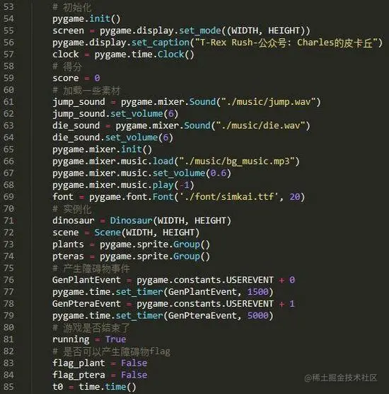 先初始化,内容包括加载游戏素材文件、实例化之前定义的精灵类和场景类、定义一些必要的常量和用户事件等: