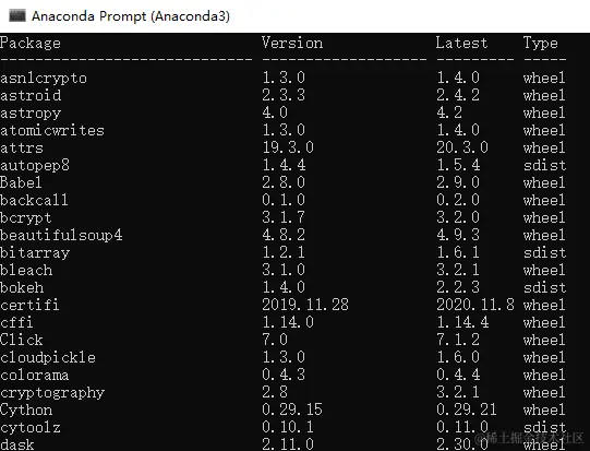 pip list 命令列出所有安装包和版本信息,pip list --outdate可以列出所有可升级的包。