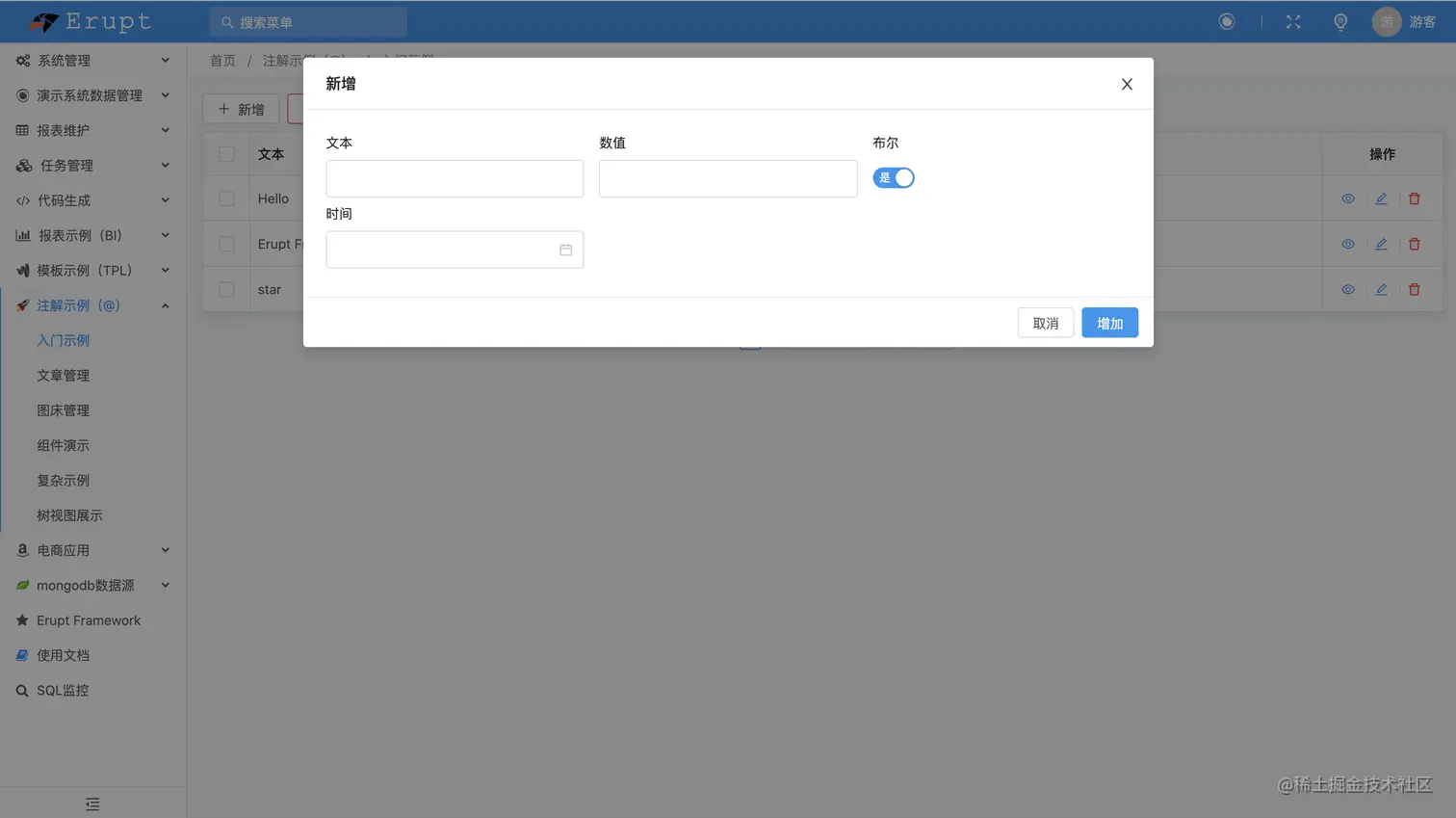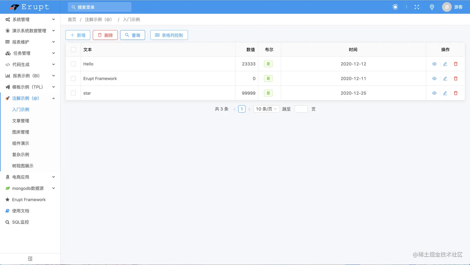 @Erupt(name = "简单的例子")
