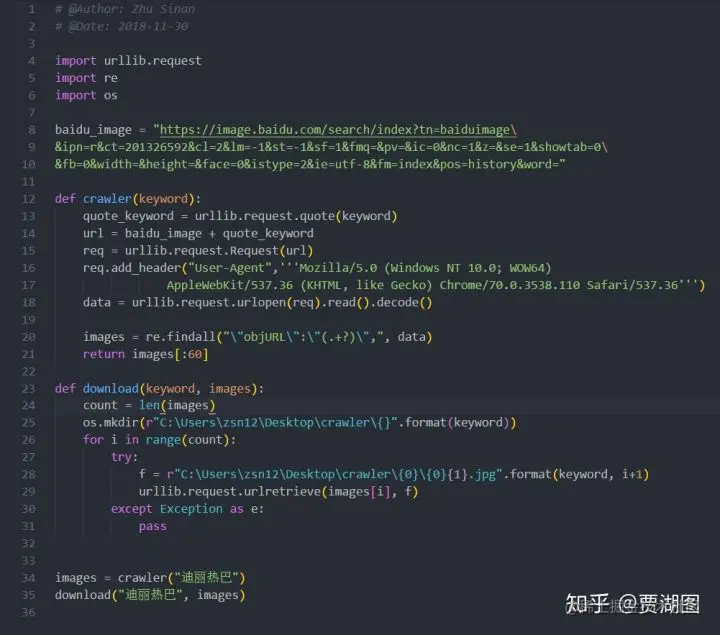 最后贴一段,我在了解了营销号口中的“爬虫”之后短时间速成的一段代码。其基本思路就是我上面说过的123。1,连接图片网站,带上搜索关键词(这里以迪丽热巴为例);2,用正则表达式抠出图片地址;3,根据地址把图片下载到本地。