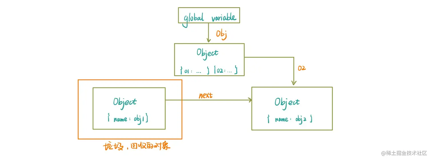 那么obj.o1就会变成垃圾,JavaScript引擎就会找到这个对象进行回收。