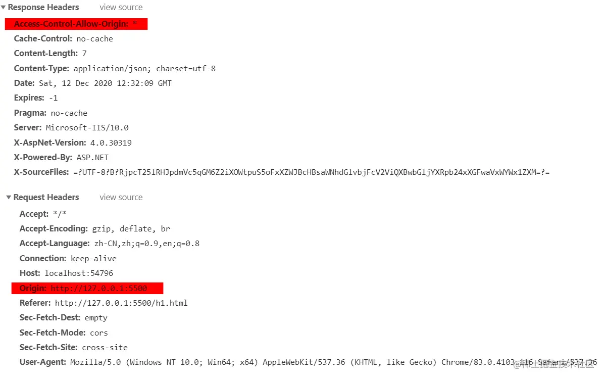 //我们需要在WebApiConfig中配置WebApi启用跨域访问 public static class WebApiConfig { public static void Register(HttpConfiguration config) { //进行cors配置 //开启WebApi的跨源访问 config.EnableCors(); // Web API 配置和服务 // Web API 路由 config.MapHttpAttributeRoutes(); config.Routes.MapHttpRoute( name: "DefaultApi", routeTemplate: "api/{controller}/{id}", defaults: new { id = RouteParameter.Optional } ); } }//什么样的跨院请求此controller可以进入 [EnableCors(origins:"*",headers:"*",methods:"*")] public class ValuesController : ApiController { public string GetRes() { //var response = Request.CreateResponse(HttpStatusCode.OK,"hello"); //response.Headers.Add("Access-Control-Allow-Origin", "*"); //return response; return "asdasd"; } }- 使用Http头,允许跨域访问