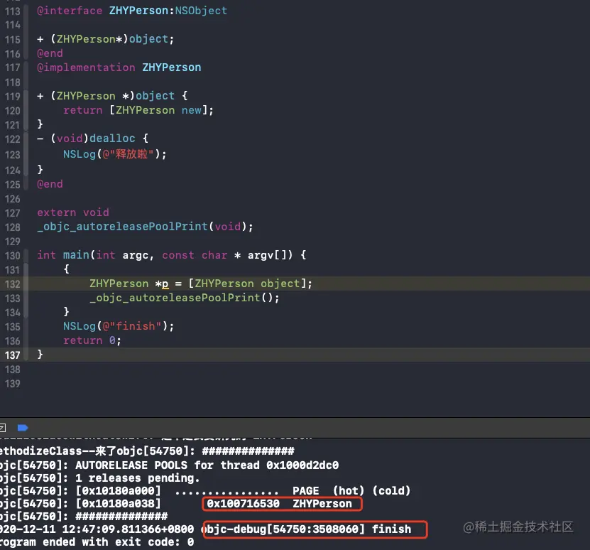p的dealloc方法没有被调用。同时我们利用_objc_autoreleasePoolPrint打印当前自动释放池中的内容,发现了确实存在p确实在自动释放池中,但是因为自动释放池并没有触发pop操作,因此p无法调用release方法,造成了内存泄漏,不过在上述情况中,执行完代码程序直接就退出了,应该也没啥问题,仅供实例参考。