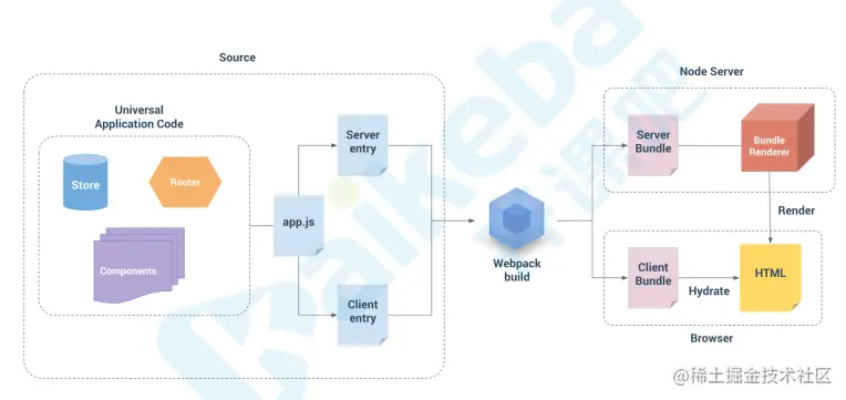 结构解析:我们的项目中包含组件components,router,store,app.js是整个应用的入口。然后CSR,SSR通过webpack分别使用server的配置文件server.entry.js,client的配置文件client.entry.js打包app.js成两个budle文件:server bundle,client bundle。server bundle会生成一个html负责首屏渲染,client bundle负责激活spa,用于后续的交互。