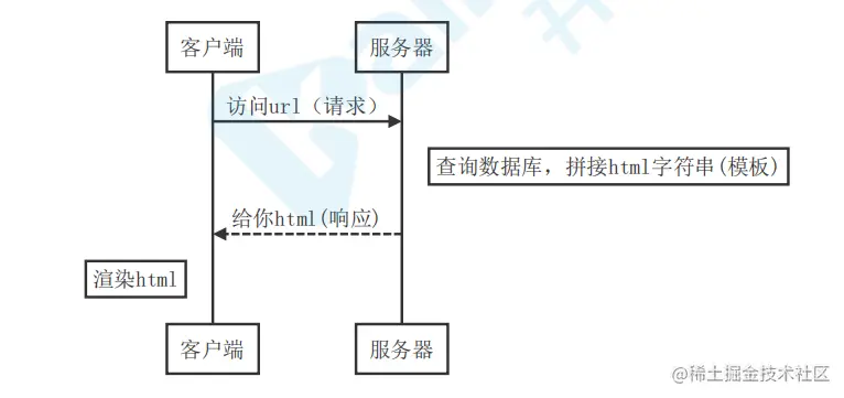 客户端负责渲染,服务端负责返回拼接的HTML,是一种最早的开发方式,比如PHP,JSP,