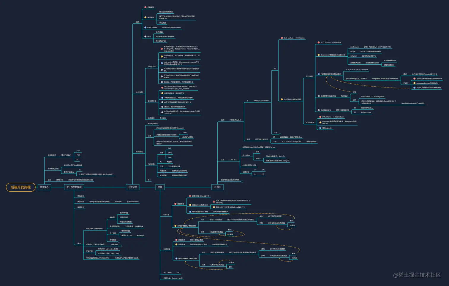 - 二是培养自己做一些延展性思考的习惯,毕竟,不想做流程的开发不是一个好架构嘛。 这个是用xmind做的脑暴图,和confluence,jira以及YApi等组件做了一些深度结合,不一定适合所有的团队,可能有一丢丢小小的借鉴意义吧,发出来当然也特别希望得到一些完善的建议。