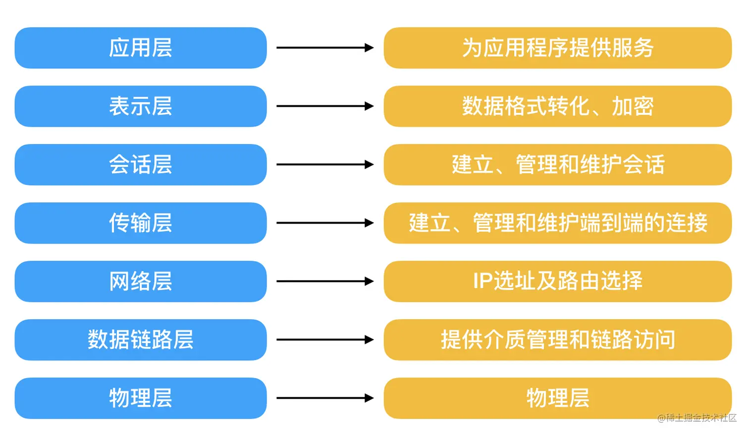 从上往下分别是应用层、表示层、会话层、传输层、网络层、数据链路层、物理层。
