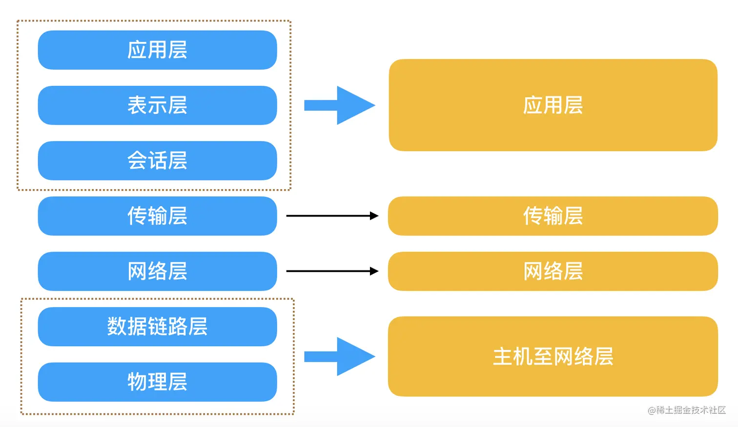 上面的描述来自于百度百科,就是将OSI的前三层合并为了一层,以拨打电话为例,只管拨打电话就好,至于中间的翻译加密这些功能都屏蔽在这一层内部了
