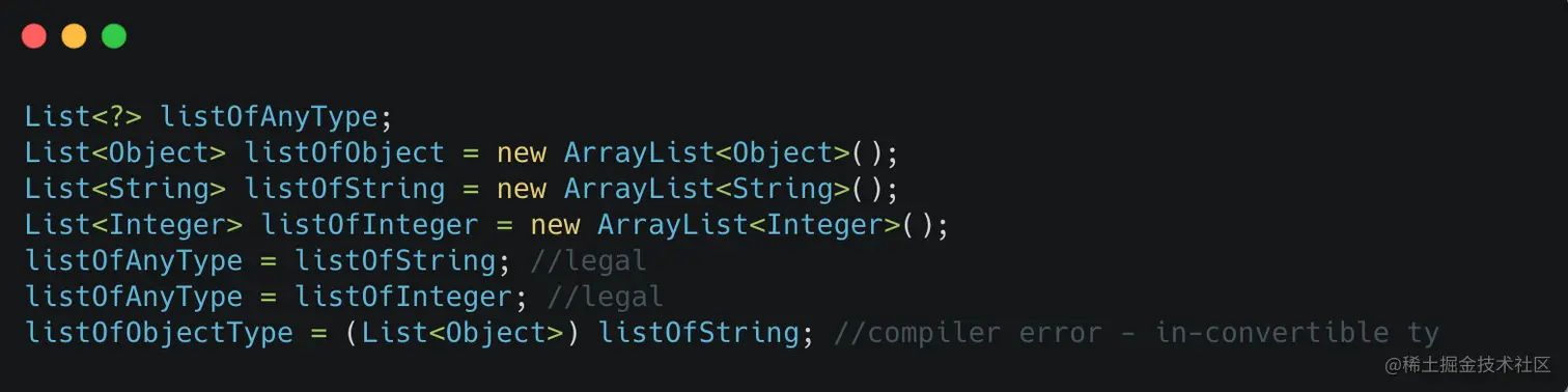 对任何一个不太熟悉泛型的人来说,这个 Java 泛型题目看起来令人疑惑,因为乍看起来 String 是一种Object,所以 List应当可以用在需要 List的地方,但是事实并非如此。真这样做的话会导致编译错误。如果你再深一步考虑,你会发现 Java 这样做是有意义的,因为 List可以存储任何类型的对象包括 String, Integer 等等,而 List却只能用来存储 Strings。