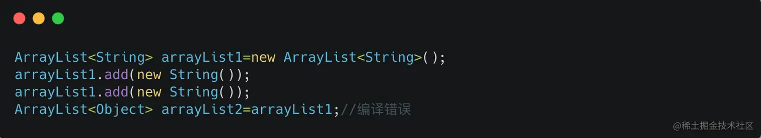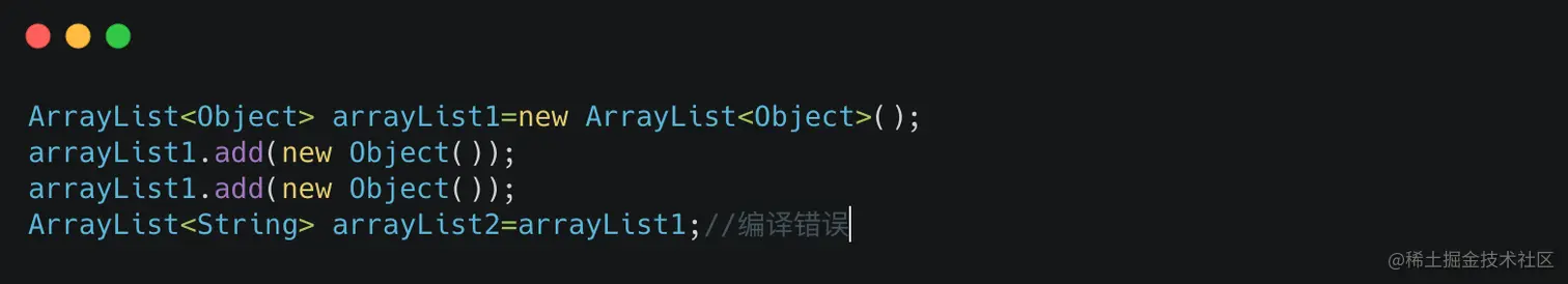 实际上,在第 4 行代码处,就会有编译错误。那么,我们先假设它编译没错。那么当我们使用arrayList2 引用用 get()方法取值的时候,返回的都是 String 类型的对象,可是它里面实际上已经被我们存放了 Object 类型的对象,这样,就会有 ClassCastException 了。所以为了避免这种极易出现的错误,Java 不允许进行这样的引用传递。(这也是泛型出现的原因,就是为了解决类型转换的问题,我们不能违背它的初衷)。