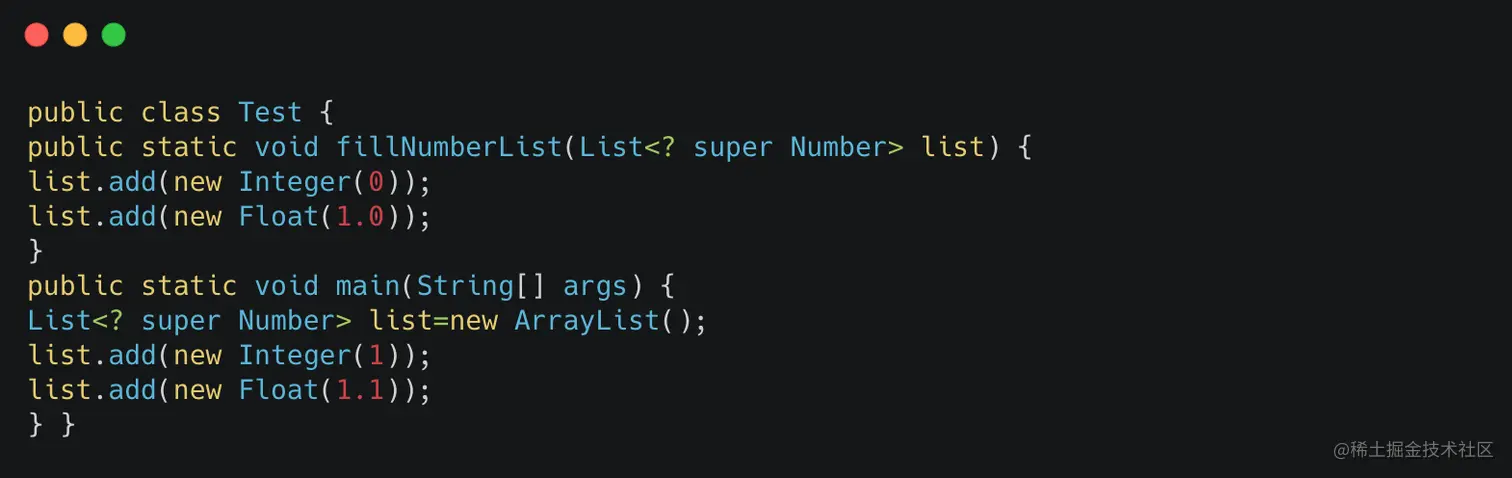 List<? super Number>可以代表 List,其中 T 为 Number 父类,(虽然 Number 没有父类)。如果说,T 为 Number 的父类,我们想 List中加入 Number 的子类肯定是可以的。