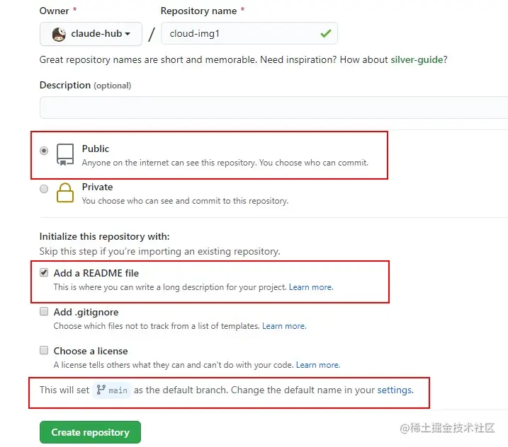 勾上生成README file,自动创建main分支,后面会用到,避免后续手动创建。