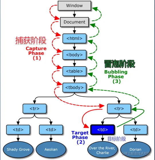 - 第一阶段:从window对象传导到目标节点(上层传到底层),称为“捕获阶段”(capture phase)。