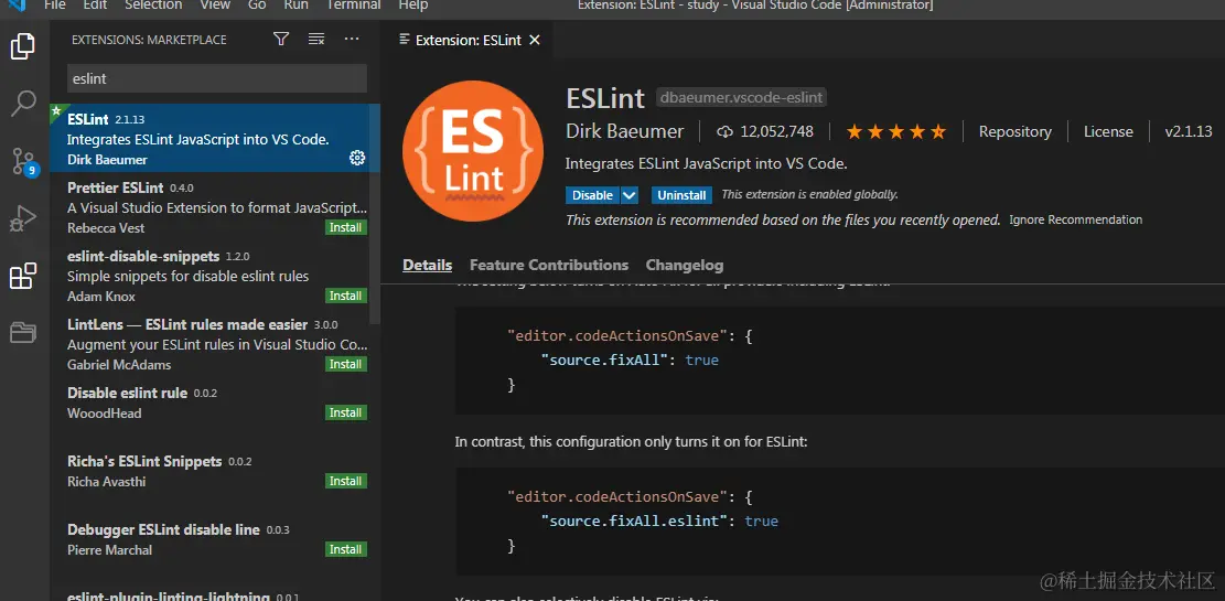 - vscode中搜索ESLint安装插件