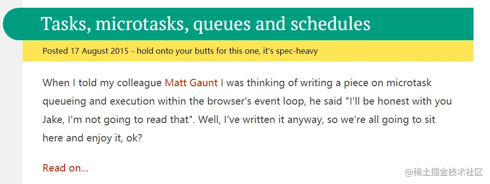 Jake Archibald是谷歌浏览器的主要开发人员。他的博客属于写得比较清晰和权威的技术博客,会放一些动态图片和代码解释原理,比较有名的就是他的一篇解释事件循环机制的文章: