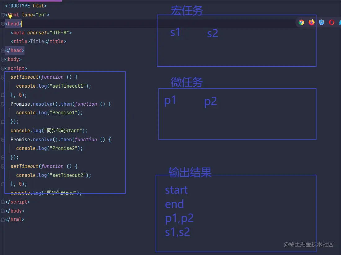 所以紧接着我们就会把s2先放一下,执行微任务,是不是p1先进入,p2后进入,采用先进先出的原则,先执行p1 ,再执行p2,紧接着就输出了promise1和promise2