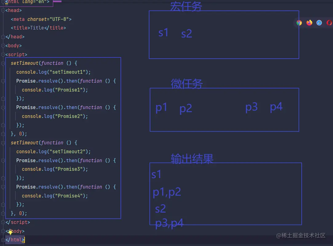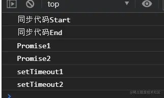 执行遇到一个同步代码就直接输出setTimeout2,之后遇到一个p3微任务,p4微任务,是不是和前面一样,放入微任务队列,s2就执行完毕了