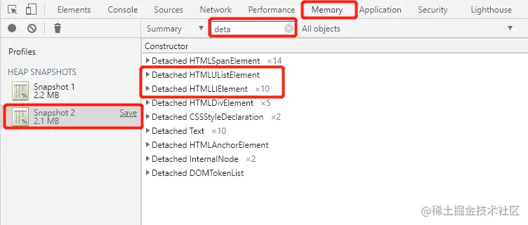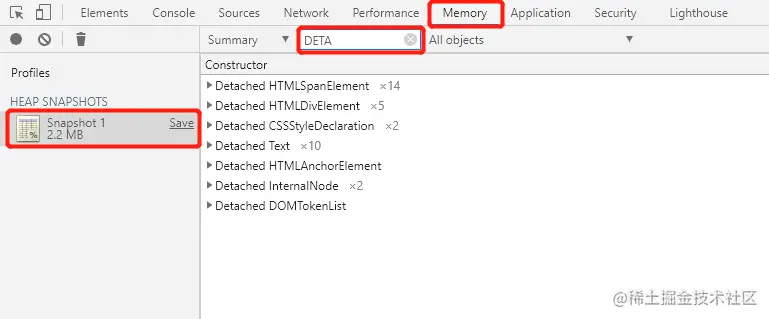 堆快照是很有针对性的查找当前的界面对象中是否存在一些分离的DOM,分离DOM的存在也就是存在内存泄漏。