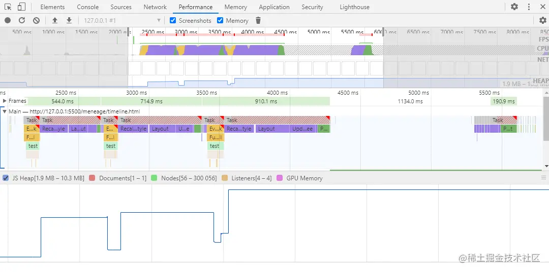 - 通过 Timeline时序图 判断,对当前性能面板中的内存走势进行监控,如果其中频繁的上升下降,就出现了频繁的垃圾回收。这个时候要定位代码,看看是执行什么的时候造成了这种情况。