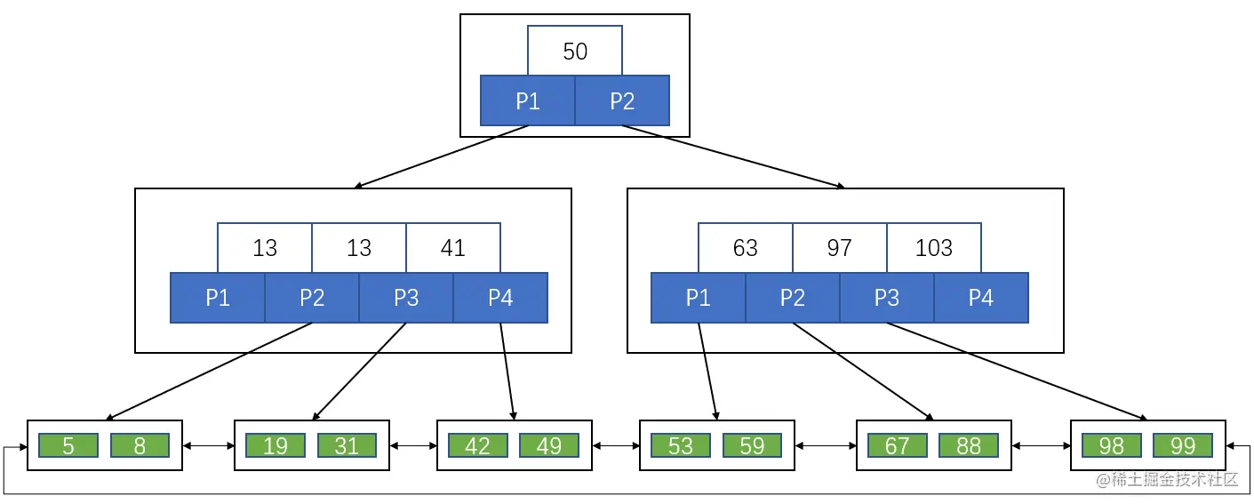 细心的同学可能发现了,除了非叶子节点不存储数据,B+树还有一点不同,那就是B+树的叶子节点还维护了一个双向指针,这个双向指针可以实现在叶子节点上不需要父节点就可以进行遍历,试想一下如果没有这个双向指针,我们进行叶子节点遍历必须依赖父节点才能确定下一个叶子节点的位置。由此我们可以通过这个双向指针,可以高效进行范围查询,比如我们要查询30到78之间所有的数据,我们可以先找到第一个大于等于30的数据,然后根据指针向后遍历,找到第一个大于78的数据就停止。