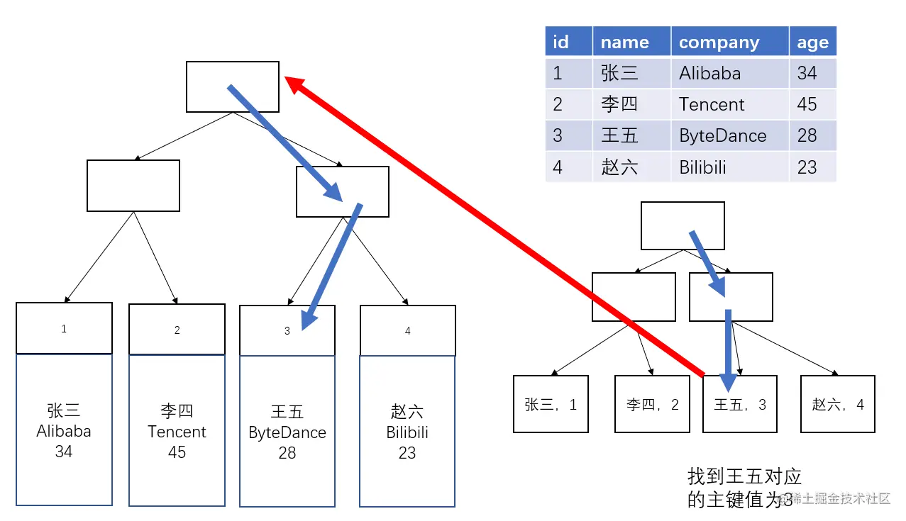 我们以上图为例,我们有四条数据的表,然后右侧是一个根据name值构成的辅助索引,其叶子节点的信息为(name,id),其中id是表的主键信息,左侧是一个聚簇索引,索引值是主键id。此时我们要查询name为王五的company信息,由于聚簇索引的索引列为id,无法直接使用索引,因此我们先通过辅助索引,找到name为王五的叶子节点,查询到王五这条记录对应的id,然后我们根据id再去聚簇索引,找到叶子节点中company信息。