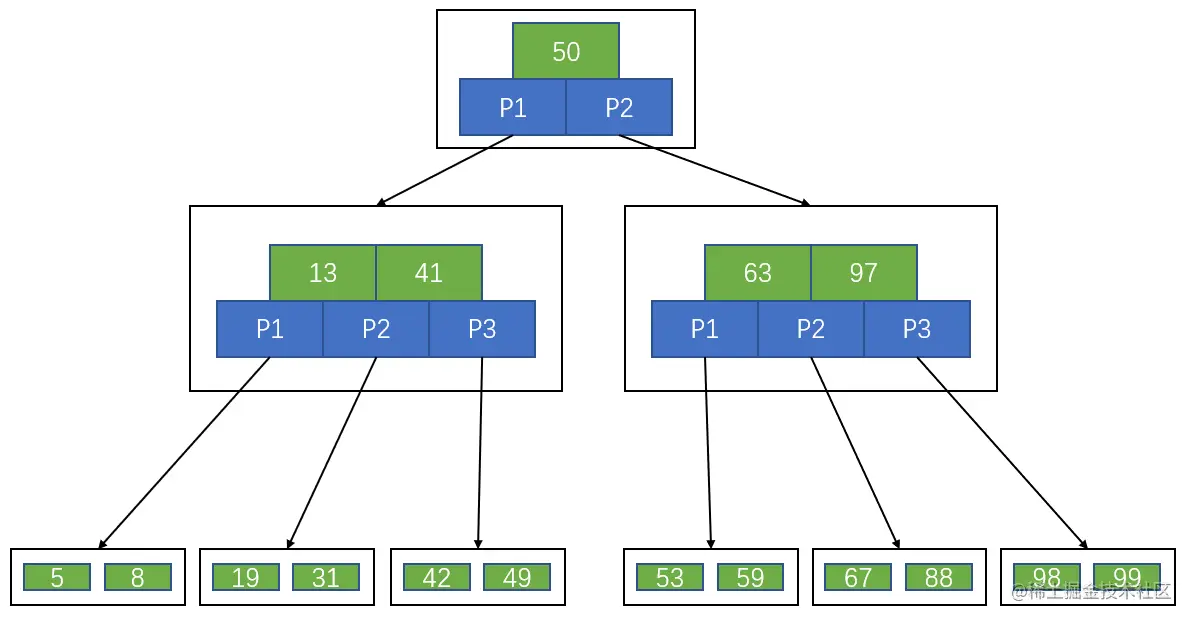 B树是数据结构中一种比较难的数据结构,他的中文名字叫做多路平衡查找树,B树中每一个内部节点会包含一定数量的键(图中绿色方块,除了图中数字,里面还包括一些别的数据列数据),键将节点的子树分开,我们先来看一下B树索引在MySQL中长什么样子吧