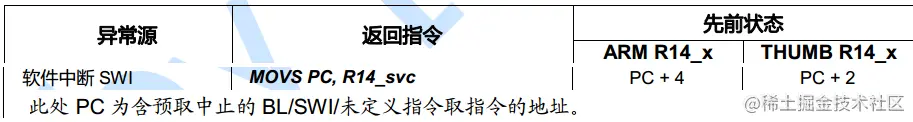 注:SP_excep为对应异常模式下SP,^符号表示恢复SPSR_excep到CPSR。