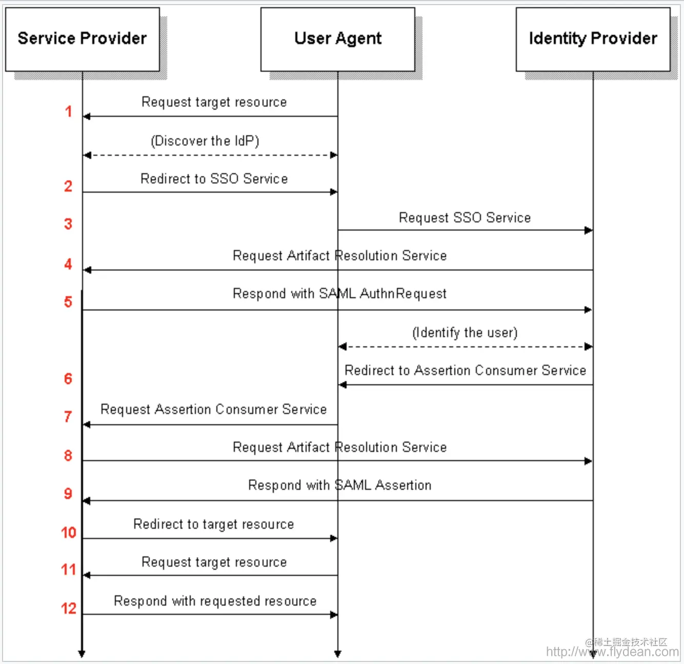 上图中User Agent就是web浏览器,我们看一下如果用户想请求Service Provider的资源的时候,SAML协议是怎么处理的。