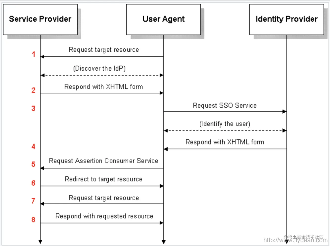 接下来,我们通过一个用SAML进行SSO认证的流程图,来分析一下SAML是怎么工作的。