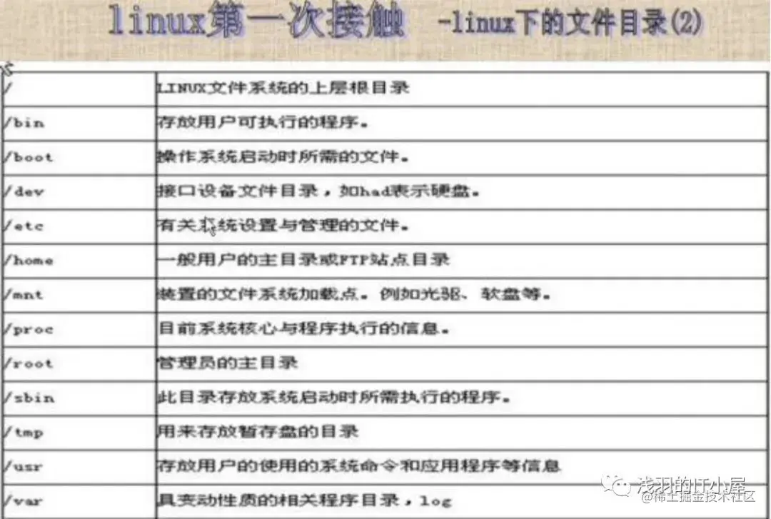 linux下的根目录中重要的目录如下是系统自动分配的root目录、home目录、bin目录、sbin目录、mnt目录、etc目录、var目录、boot目录、usr目录、tmp目录(均为同级目录) root目录:用于存放root用户相关文件的目录home目录:用于存放普通用户的相关文件的目录bin目录:用于存放常用命令的目录sbin目录:用于存放要具有一定权限才可以使用的命令的目录mnt目录:用于默认挂载软驱、光驱的目录 这个目录可以用来进行挂载文件 或者使用共享文件etc目录:用于存放配置相关的文件的目录var目录:用于存放经常变化的文件的目录boot目录:用于存放系统引导文件的目录(重要)usr目录:用于存放安装的默认目录(安装文件会默认安装在usr目录里)tmp目录:用于存入临时文件的目录 cd /返回到主目录下ls与dir功能相同显示目录名