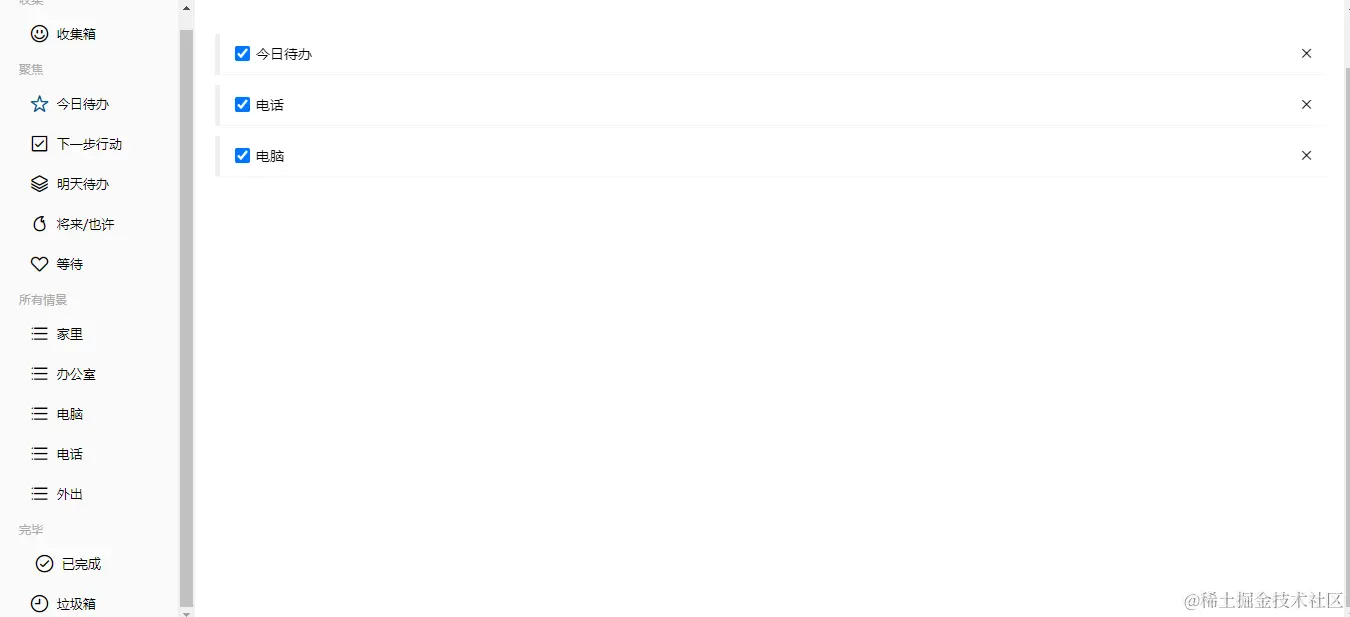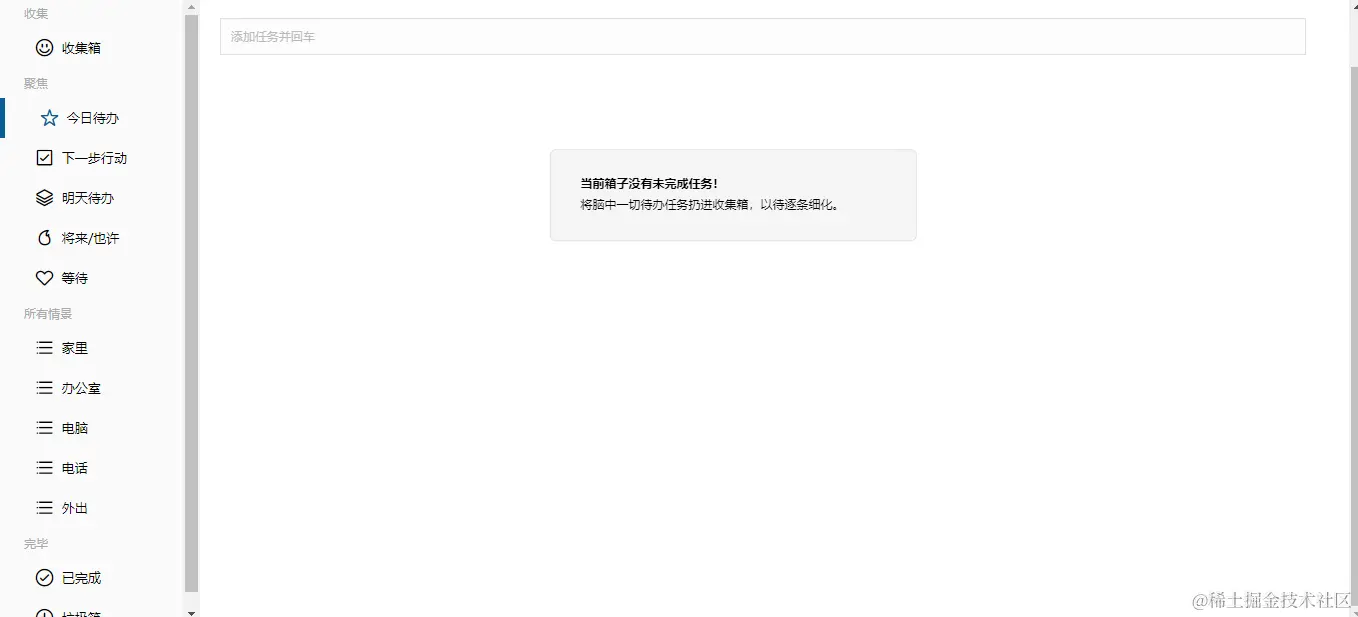 2.今日待办、下一步行动、明日待办、将来、等待、家里....剩下子页面都是添加事项、勾选事项到已完成页面,当前事项没有了,点击交叉直接删除,当前事项没有了,显示时,如果当前页面没有事项,显示提示信息,显示只显示当前页面添加的事项,其他页面添加的事项不进行显示