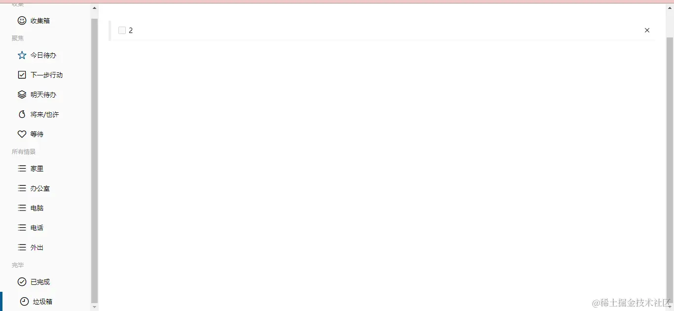 1.收集箱页面:在输入框中输入内容,显示到下方,当勾选复选框,当前事项没有,并在已完成页面中显示,点击交叉,直接删除事项,不会去到垃圾箱,显示时,显示所有数据【未完成事项】,如果当前页面没有事项,则显示提示信息